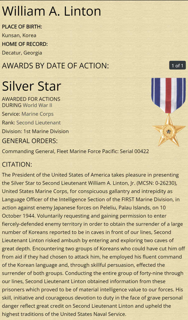Bill returned from the Pacific in 1946. He had received a Silver Star for capturing 49 prisoners on the island of Peleliu. These prisoners were Koreans and were hiding in a cave. Bill was able to persuade them to come out. He spoke Korean to them and discovered one of the men had attended his father’s school in Korea. This led them all to surrender to Bill. He did not carry a weapon except a knife in his boot.