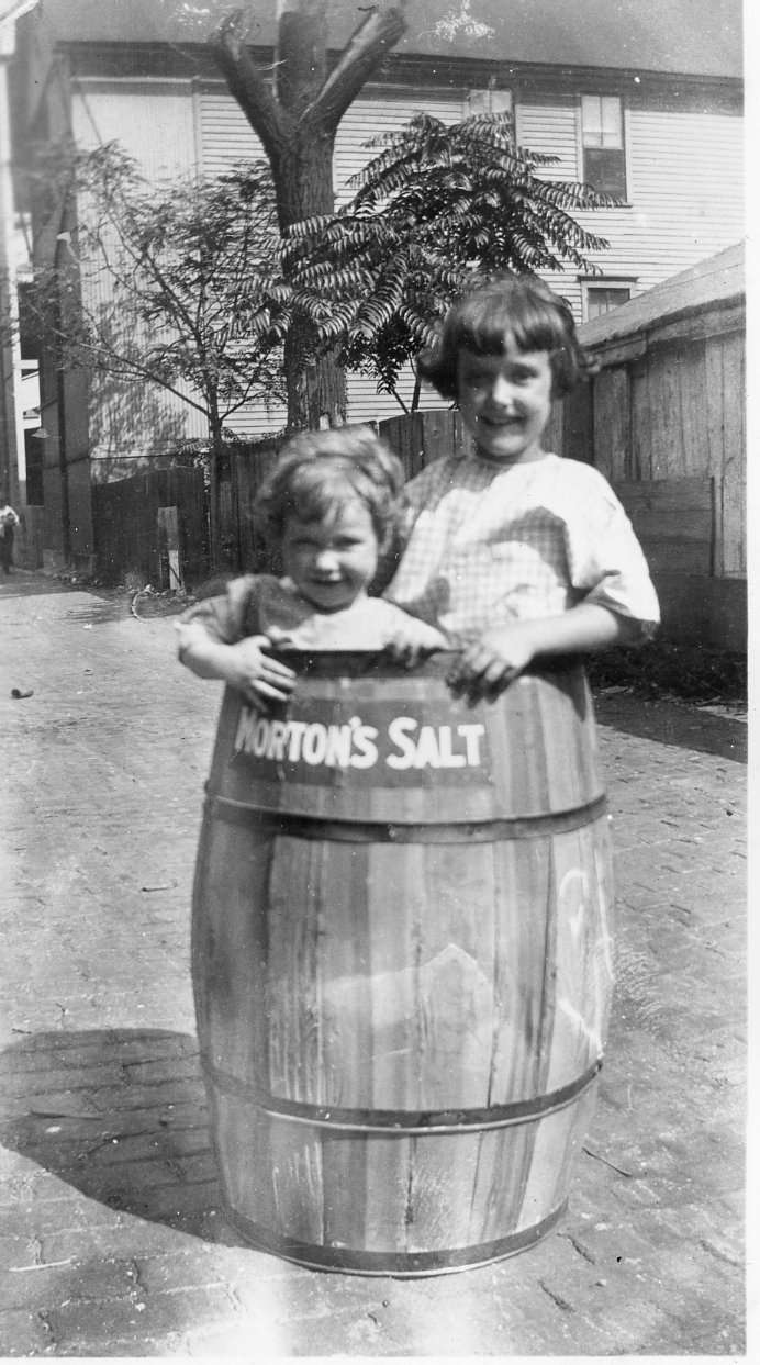 Behind Grandma’s house there was an alley. The trash man in his horse-drawn wagon picked up the trash; the milk man brought milk, cream, butter and eggs and there was a man who called “rags and old iron” driving his horse and wagon down the cobbled stone alley. Once when there was an empty “Morton Salt” barrel in the alley, my Aunt Anne picked up Winnie and me and put us in it to take a picture. I have that picture today.